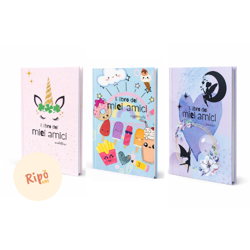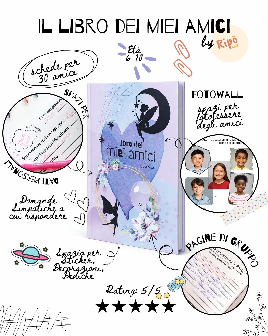 Perfetto per la scuola, sport, compleanni, Natale: “Il libro dei miei amici” by Ripò kids contiene spazi per foto, disegni, dediche, citazioni, decorazioni e include schede per 30 amici, oltre a pagine di gruppo da compilare insieme.